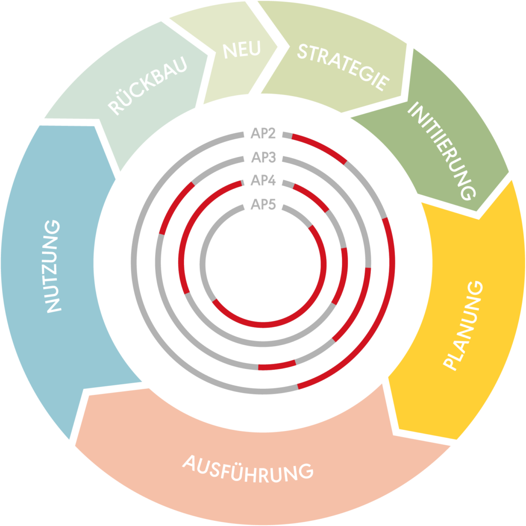Projektinhalte nach Arbeitspaketen im Gebäudelebenszyklus